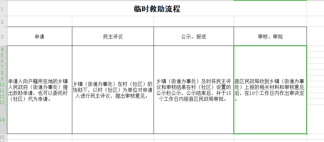 | 行使内容 | 对遭遇突发事件、意外伤害、重大疾病或其他特殊原因导致基本生活陷入困境,其他社会救助制度暂时无法覆盖或救助之后基本生活暂时仍有严重困难的家庭或个人给予的应急性、过渡性救助。 | 权限划分 | 临时救助金额不超过当地当年城市月最低生活保障标准3倍的,县级人民政府民政部门可以委托乡镇人民政府(街道办事处)审批,自受理之日起10个工作日内完成审核审批手续,并发放临时救助金;临时救助金额超过当地当年城市月最低生活保障标准3倍的,由县级人民政府民政部门按规定程序审批。 |